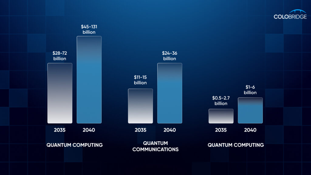 - квантовые коммуникации — $11-15 млрд к 2035 году, $24-36 млрд к 2040 году