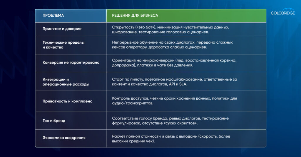 Пользователи любят быстрые ответы, но не готовы полностью доверять ИИ. Нужно четко очерчивать возможности чат-бота, давать возможность привлечь живого оператора, минимизировать работу с чувствительными данными и шифровать данные (особенно чувствительные). Также голосовые сценарии стоит тестировать на ложные срабатывания, чтобы избежать нежелательных заказов.