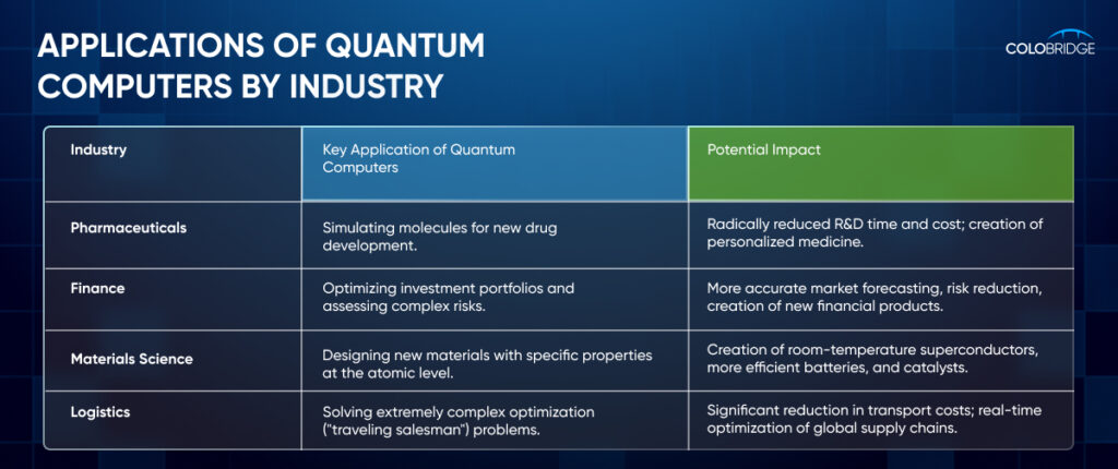 The unique capabilities of quantum computers, such as massive parallelism based on the principles of superposition and entanglement, allow them to process vast amounts of data simultaneously. This gives them the potential to revolutionize several sectors.