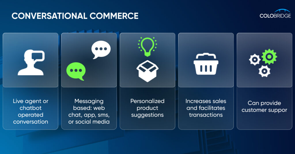 У розмовній комерції, яка часто стає результатом цифрової трансформації, це означає, що ШІ-агент не просто відповідає на запитання, а й активно веде користувача через унікальний для нього шлях покупки — від рекомендацій товарів, враховуючи стиль чи подію (наприклад, «Мені потрібна сукня подружки нареченої, весілля за два тижні»), через відслідковування замовлення до оплати та організації повернення. Якщо клієнт питає про акції або просить порадити подарунок, агент підбирає персоналізовані варіанти з урахуванням історії покупок, трендів і наявності.