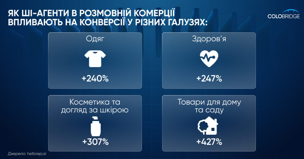 Ці дані ілюструють, як різні категорії товарів отримують ріст конверсій завдяки впровадженню AI-рішень у розмовну комерцію.
