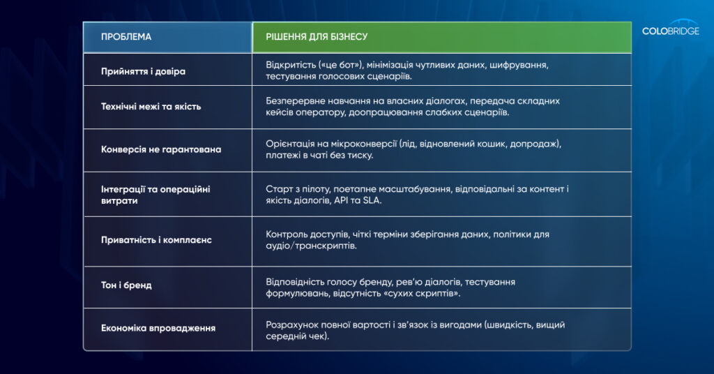 - Дані та відповідність. Розмови містять персональні дані, тому потрібні шифрування, контроль доступу, політики збереження, а також локалізація під GDPR і вимоги клієнтів.